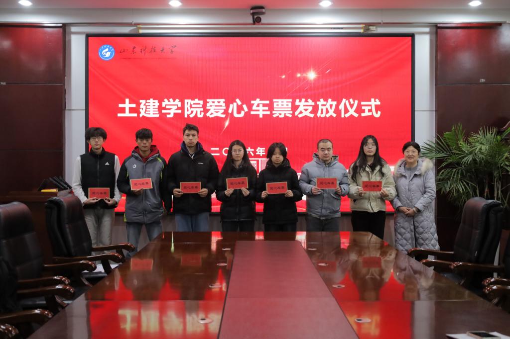 寒假将至,年味渐浓。为传递学院对学子的深切关怀,落实资助育人工作要求,1月13日,土建学院爱心车票发放仪式在J15-316会议室举行。学院党委副书记高静,学工办全体辅导员老师参加此次活动。