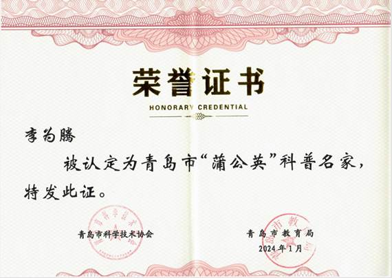 3-18 社会贡献:李为腾获得青岛市“蒲公英”科普名家称号