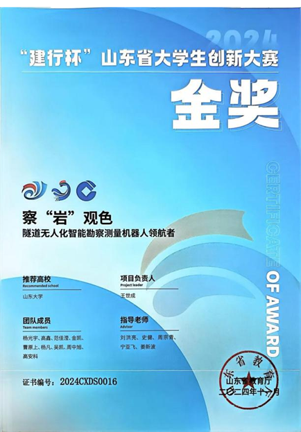 4-28 山晖青隧工程师小队(曹原上等)荣获第十四届“建行杯”山东省大学生创新大赛金奖